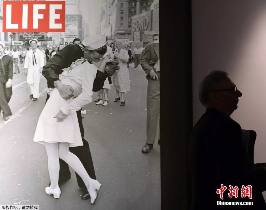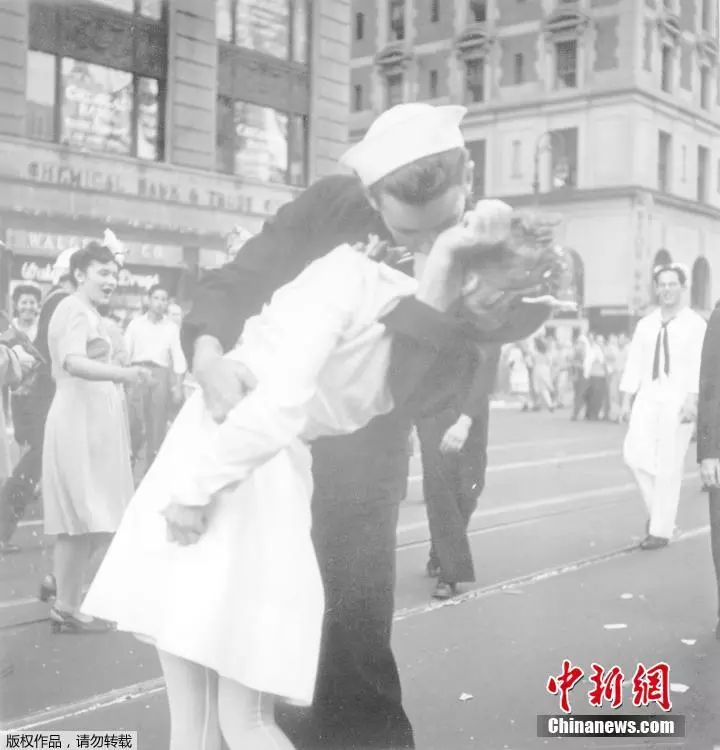 资料图:《生活》杂志摄影师艾森斯塔德在1945年拍摄的经典影像“胜利之吻”。