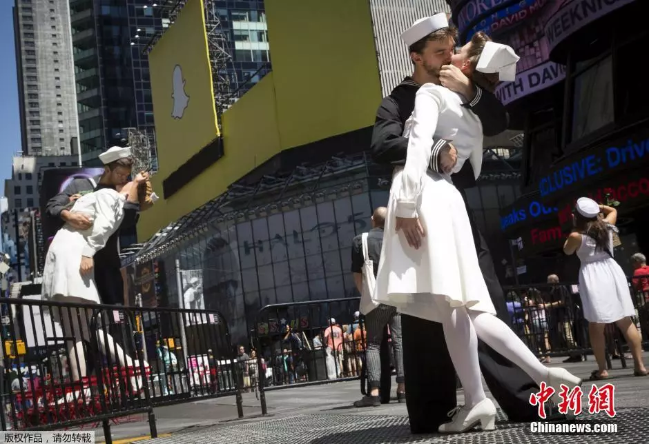 资料图:2015年8月14日,情侣穿着海军和护士的服装在纽约时代广场接吻,重现“胜利之吻”,纪念二战结束70周年。
