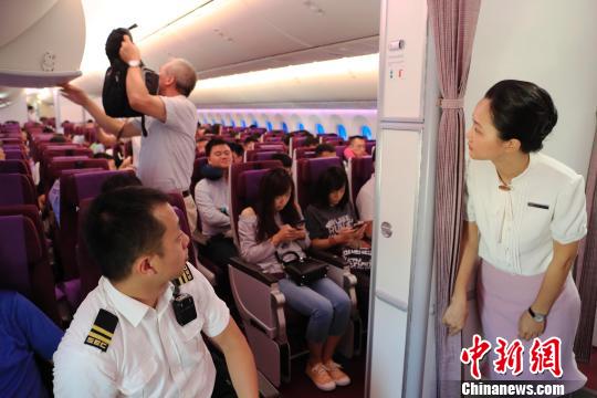 方冠尹在客舱门口欢送旅客抵达目的地。 殷立勤 摄
