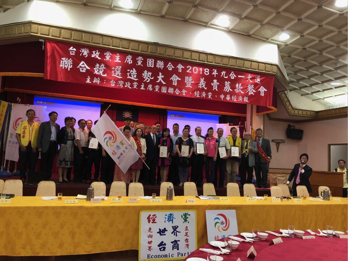 经济党主席张采明(披彩带者)和台湾前中选会主委黄石城(中间穿黑西装者)共同授证台湾政党主席党团联合会的竞选团队与顾问