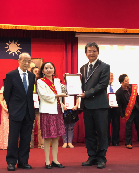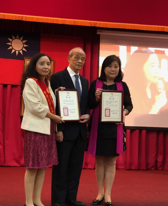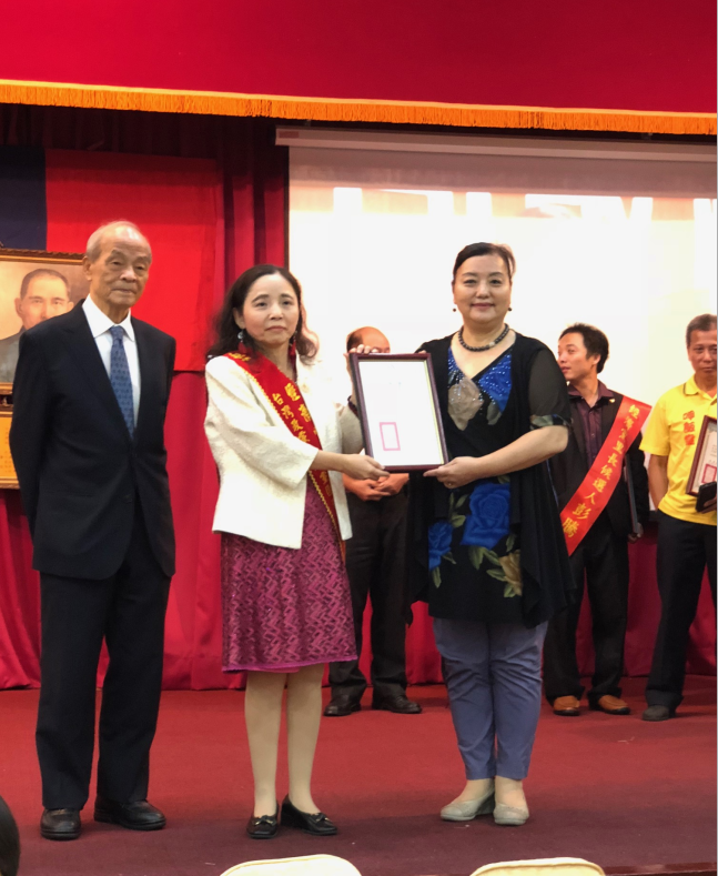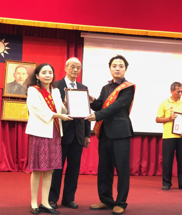 经济党主席张采明和台湾前中选会主委黄石城共同授证中華全球華僑總會會長暨人民正義黨主席王譽茹為台灣政黨主席黨團聯合會的顧問