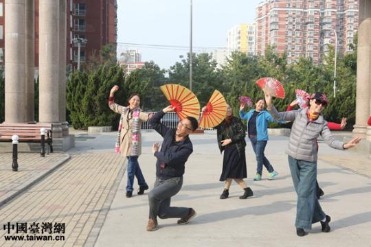 两岸记者与阳春新纪元里的大妈一起跳广场舞《中国范儿》。(中国台湾网 陈佳慧 摄)