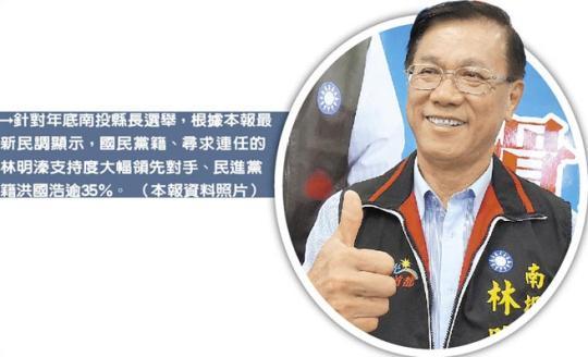 针对年底南投县长选举,根据旺旺中时媒体集团最新民调显示,国民党籍、寻求连任的林明溱支持度大幅领先对手、民进党籍洪国浩逾35%。(图片来源:台湾《中国时报》)