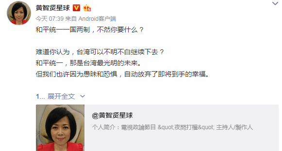 【环球网综合报道】昨天发文反驳蔡英文猖狂言论之后,台湾知名主播黄智贤今天继续在微博发布文章,题为《和平统一“一国两制”,不然你要什么?》