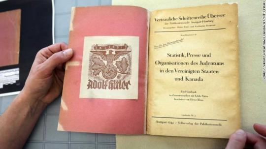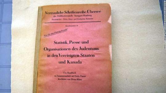 CNN介绍称,这本书共137页,题目为《美国和加拿大犹太人统计数据、媒体和组织》,由德国语言学家兼研究者海因茨 克洛斯在1944年编写的。克洛斯曾负责为纳粹政权进行关于国籍等问题的重要研究,特别是关于美国。